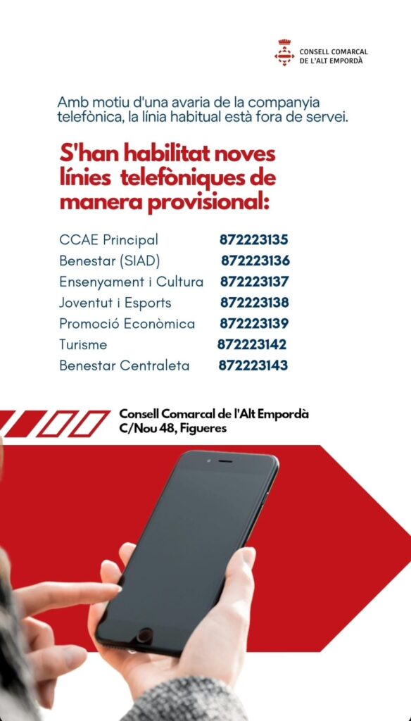 Com a conseqüència d’una avaria de la companyia Telefónica, la línia habitual del Consell Comarcal està fora de servei. A la imatge podeu veure els telèfons provisionals si voleu contactar-hi.
