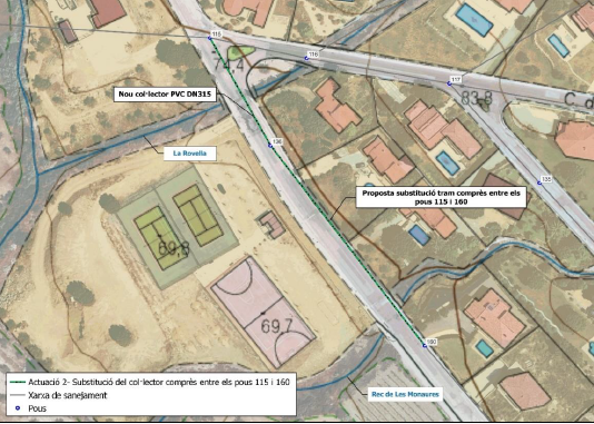 Substitució del tram de clavegueram entre els pous 115 i 160. Substitució de 169 metres de canonada de formigó en mal estat per una canonada de PVC sense juntes (per on s’infiltra molta aigua). La substitució d’aquest col·lector suposarà una reducció d’intrusions d’aigües blanques d’un 16%.