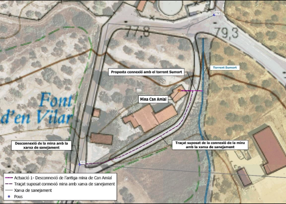 Desconnexió de l’antiga mina de Can Amiel de la xarxa de clavegueram. La mina es connectarà directament amb el rec de Sumort i això permetrà reduir un 8% l’entrada d’aigües blanques a la xarxa de sanejament.