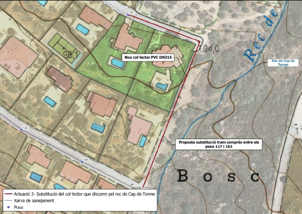 Substitució del tram de col·lector que passa per el Rec de Cap de Terme. Aquest col·lector presenta esquerdes i arrels a les juntes entre els pous 127 i 162. La longitud de canonada que se substitueix 212,3 metres. Aquesta actuació evitarà l’entrada del 30% de les aigües blanques que hi ha actualment a la xarxa.