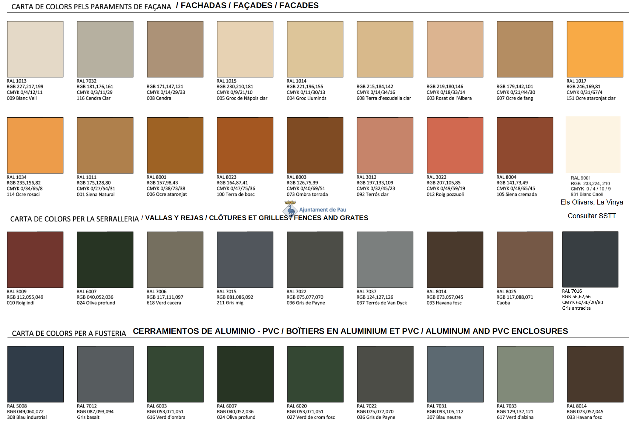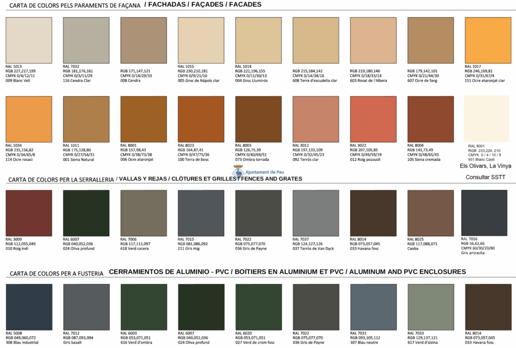 La Carta de Colors de referència consta de 36 tons que dialoguen amb les gammes terroses, ocres i vegetals pròpies de Pau i de la Serra de Rodes. Està disponible a l’Ajuntament i al web municipal.