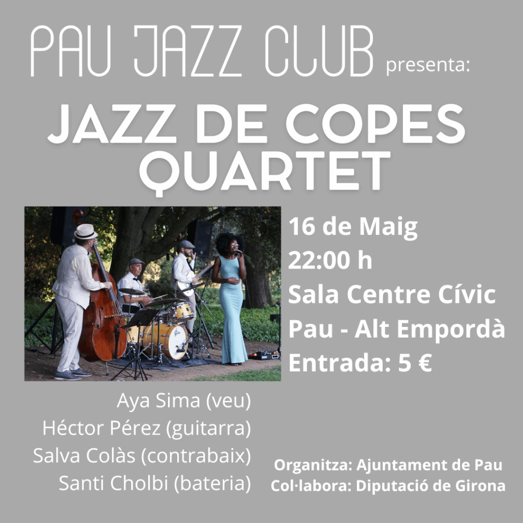 El pròxim divendres 16 de maig a les 22:00h hi haurà un concert al Pau Jazz Club a la Sala Teatre del Centre Cívic a càrrec del quartet Jazz de Copes, format per Aya Sima a la veu, Héctor Pérez a la guitarra, Salva Colàs al contrabaix i Santi Cholbi a la bateria que oferiran un concert ple de ritmes de jazz, pop, soul i bossa.
