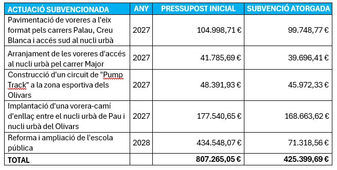 Són 425.399,69€ que serviran per finançar els projectes que podeu veure a la primera columna, els quals s’aniran executant segons les anualitats que veieu a la segona columna.