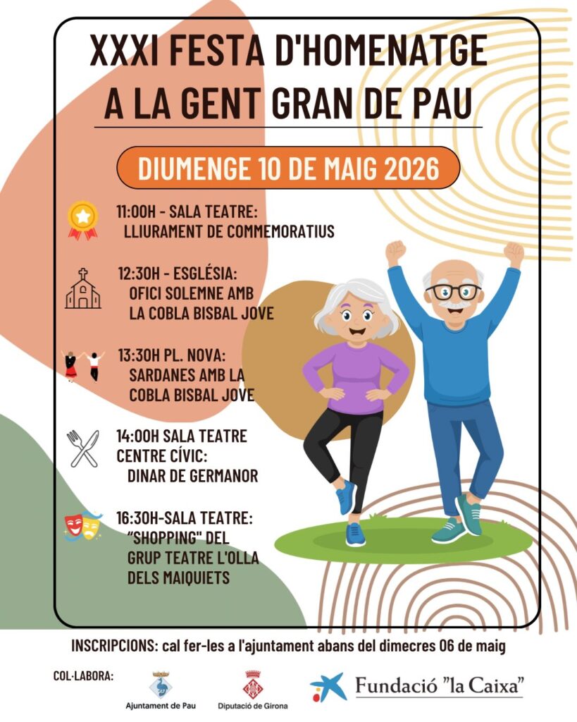 El diumenge 10 de maig celebrarem la XXXI Festa d’homenatge a la gent gran de Pau. Cal fer les inscripcions a l’Ajuntament abans del 6 de maig. Teniu a continuació el programa dels actes previstos.